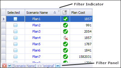 Note: When filtering is applied to columns, displays to the right of the column header. A Filter panel also displays at the bottom of the grid that describes applied filters as illustrated in the following: