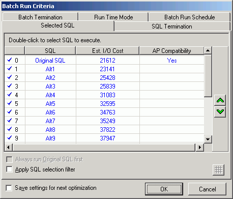 Specify to always run the original SQL statement first despite sort order of the Est. I/O cost. This checkbox is dimmed if the Original SQL option is selected in the Termination Criteria or Batch Termination tab of the Batch Run Criteria window.