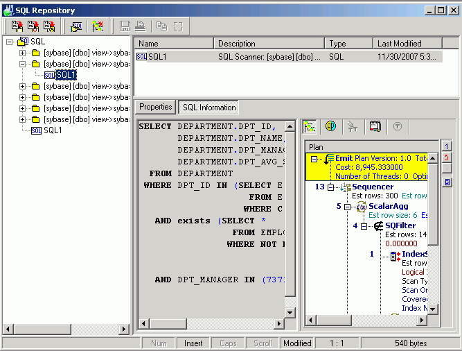 The SQL Repository window displays the information about the SQL statements that are saved in the SQL Repository. It is divided into three panes.