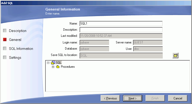 The General page of the Add SQL wizard is used to name the SQL statement and to select the folder where you want the SQL statement saved.