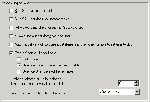 If selected, the scanning algorithm automatically creates a temporary table during scanning when a CREATE TABLE #TEMP or a SELECT INTO #TEMP statement is found. Tables created during the scanning process are dropped at the end of the process.