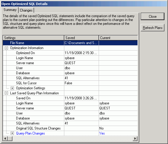 This window is only available after the saved query plans were replaced with the current query plans by clicking Refresh Plan on the Open Optimized SQL Details window.