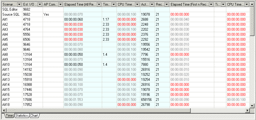 The Records column shows the number of records processed by the SQL statement. This number should be constant. It is an indication that the alternative SQL statements are semantically equivalent to the original SQL statement.