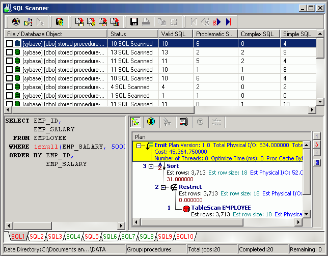 The SQL Scanner window has 3 panes, a status bar and a toolbar.