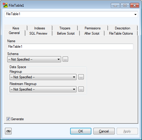 • FilestreamFilegroups - Similarly to Filegroups, FilestreamFilegroups work in Toad Data Modeler only as a list. During script generation, the FilestreamFilegroups definition is not generated and during reverse engineering  the definition is not loaded either (only names are loaded).