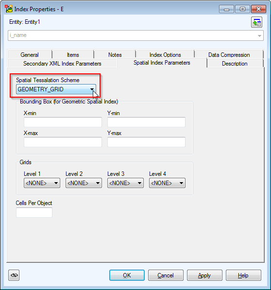 New Spatial Tessalation Scheme box with new options GEOMETRY_AUTO_GRID and GEOGRAPHY_AUTO_GRID. Based on selection, further Bounding Box and Grids options are enabled or disabled.
