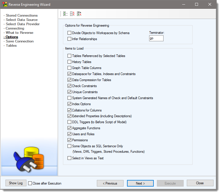 • Entity, View, Relation, Trigger (entity/view), Key, Index, Default, Rule, DictType, UDT, Procedure, Function, Aggregate (Functions), Synonym, Assembly, Sequence, FileTable