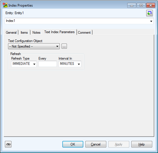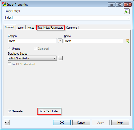 TEXT INDEX supported – select the Is Text Index checkbox and define other properties on tab Text Index Parameters.