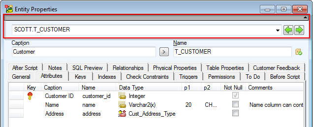 Example: The Entity Properties form (Oracle 10g db). Object navigator collapsed.
