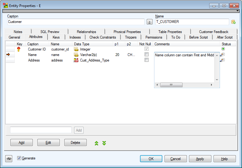 - When you assign an attribute to a key (PK, AK), the Not Null checkbox of the attribute will be checked. (But you are able to uncheck it)