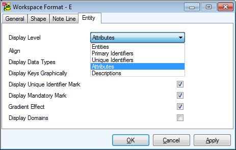 Display Level - Select items you need to display in your logical model -  Entities, Primary Identifiers, Unique Identifiers, Attributes, Descriptions.