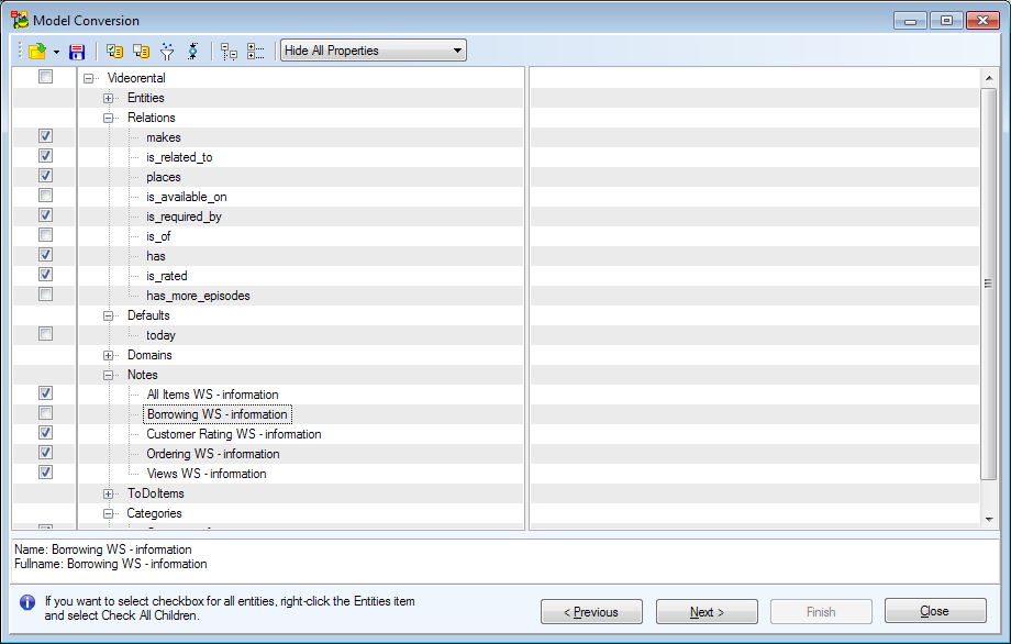 Explanation: Some objects are related together (e.g. entity and domain, entity and relationship). Let's say you uncheck a Domain in Select Object Types dialog. However you keep an Attribute of the Domain type checked for conversion. In the next screen the Domain will be selected for conversion (and highlighted in gray), even if you don't want it to. This is because of its relationship with the Attribute, which cannot exist without the Domain.