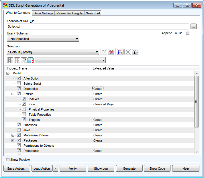 Objects Grid In this grid you select objects you want to generate by checking them in the Property Name column. And in the Extended Value column you can choose the SQL statement which should be used for the specific item in the final script (e.g. create, replace, drop).