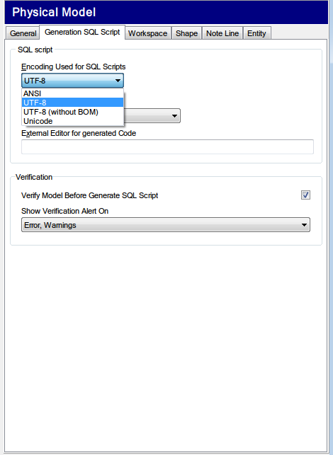 1. Go to Settings Menu | Options | Model | Physical Model | SQL Generation Script tab | SQL Script section.