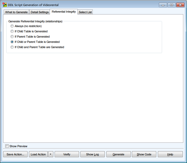 The main selection of objects for generation takes place in Select List. Referential integrity further specifies which relations are generated. It has the following options: