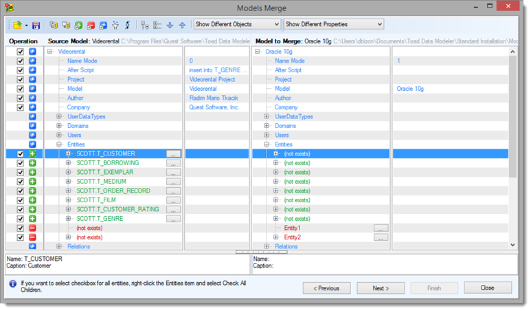 • Model Merge in the Model Actions - allows you to see differences between two models, select particular items to merge and merge the models either to already existing model or to a new model.