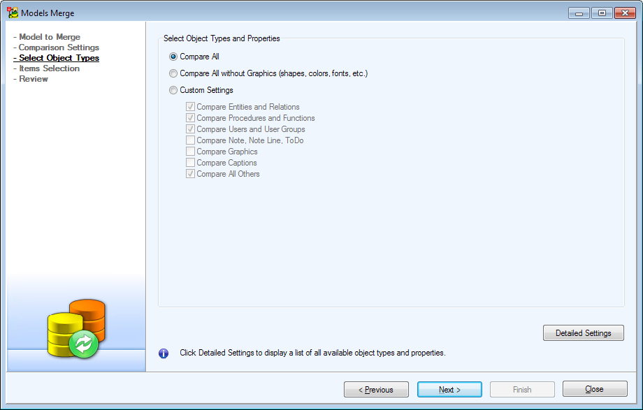 • Now you have to choose what types of objects will be included in the comparison. If you wish to select objects in more detail, click on Detailed Settings.