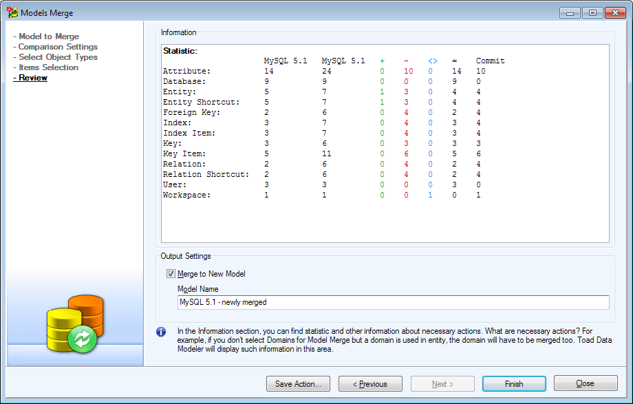 • Check the Review screen which show you the changes for each object type. If you want to merge models into a new model, check Merge to New Model and enter its name.