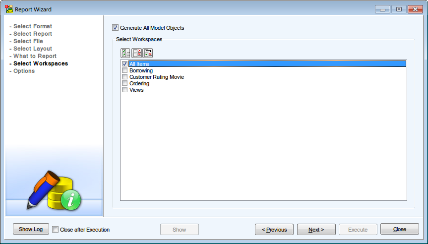 - When you check Generate All Model Objects, all model objects will be included in the report.