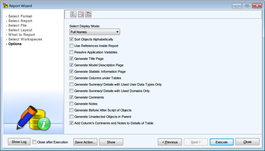 Tip: You can generate localized reports. Download the appropriate language package from the community website and import it to Toad Data Modeler. See Dictionaries for more information.