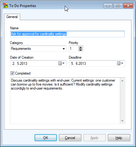 • Particular object of your model in its Properties dialog (see the Entity Properties form | To Do tab)