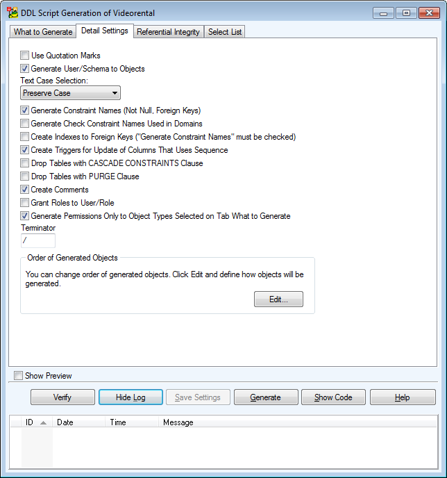 Uncheck the Table Properties/ Materialized View Properties checkbox not to generate the content of these tabs in entity and materialized view dialogs.