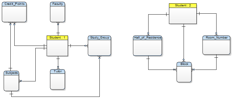 Solution: A shortcut of the Student entity has been created and used in another part of the model. This way, the model has been logically divided into two blocks and became much clearer and better arranged.