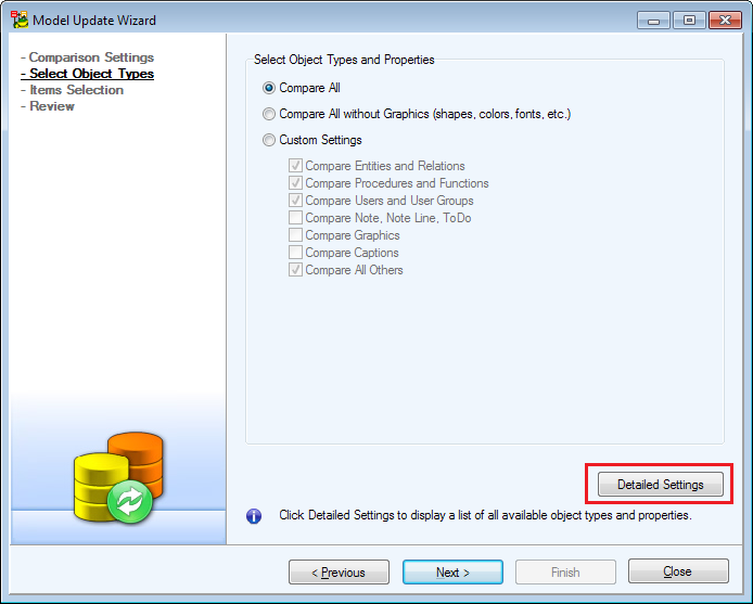 • Here you can select what types of objects should Toad Data Modeler compare between given model and the database. If shown settings aren't detailed enough for you, click on the Detailed Settings button. This will allow you to choose not only from all groups of objects, but from the objects themselves. To update everything in your model, check every checkbox or select Compare All.