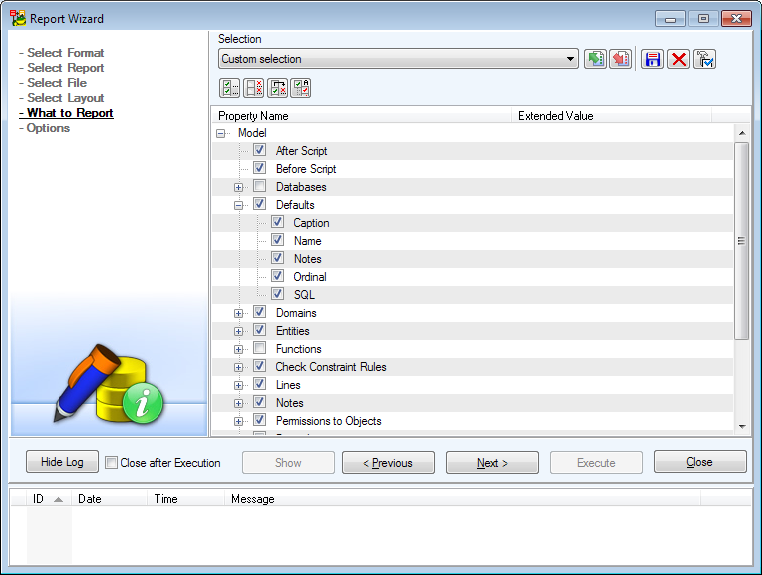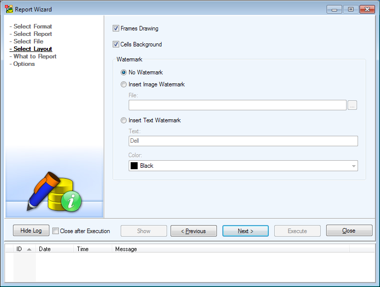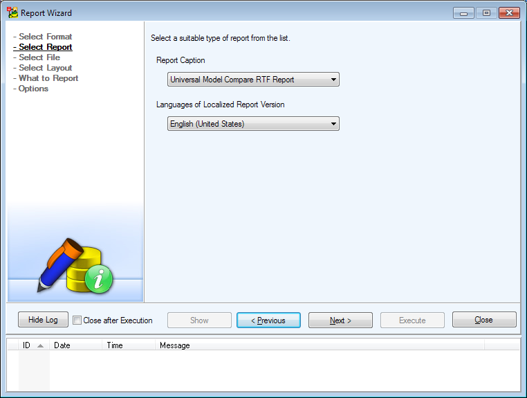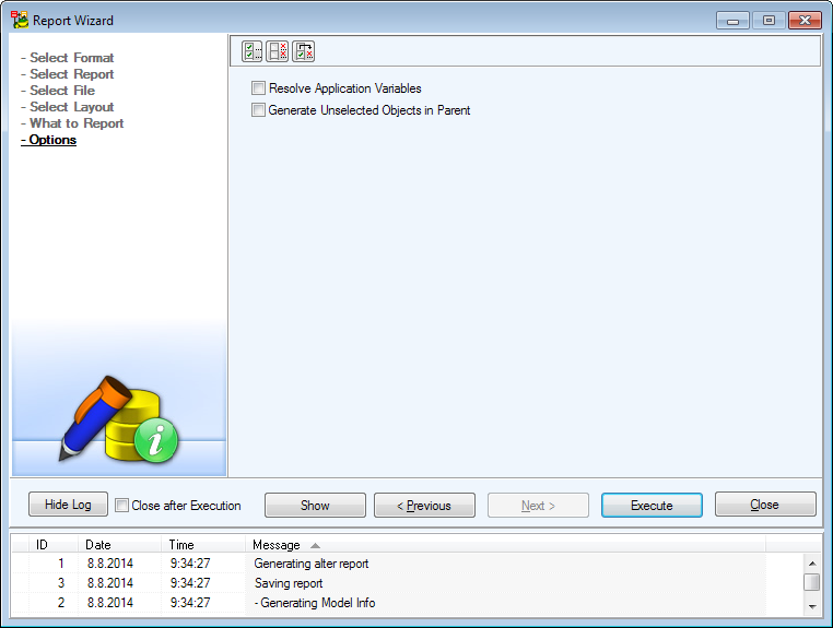 • There are two options available during the entire process of generating a report. Hide Log hides the bottom part of the dialogs which otherwise displays information related to the generation. Checking Close after Execution closes the dialog window after you're done creating your report.