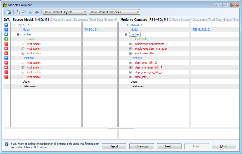 Note: The selected model has to be of the same database platform and version. You cannot compare DB2 10.5 and MySQL 5.1 models, or MySQL 5.1 and MySQL 5.5 models.