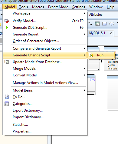 Solution: Compare the models and generate Alter Script in Toad Data Modeler. Then use a third party software to connect to your database and execute the generated script. All your changes are now reflected in database. (Note: Change Script generation is not supported for all databases, for further information see Supported Databases.)
