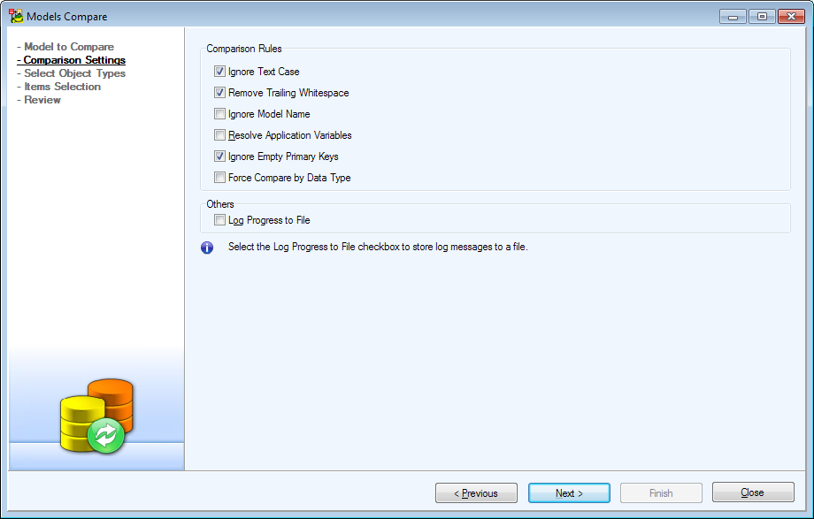 • The next dialog presents you with a couple of setting related to Model Comparison. When you're done editing the options, click on Next.