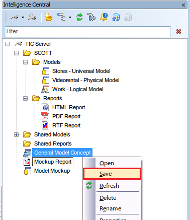 Intelligence Central displays all items that are shared with you. You can publish all types of models and reports to your TIC server: