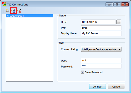 3. In the opened TIC Connections dialog, click the New Connection button and fill in connection details. Then, click the Save Connection button (or you can Connect right away, changes will be saved).