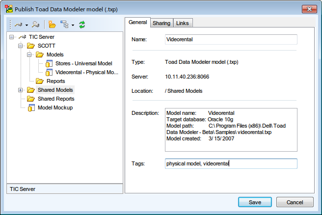 When you choose to publish model/report to your TIC server, you can also describe your file, customize its sharing and link it to existing artifacts.