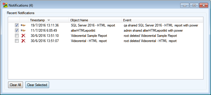 Notifications windows displays the timestamp of recent actions, the object on which the action was applied and type of the action (event).