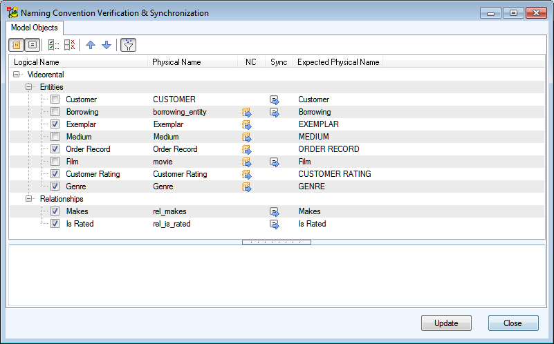 Note: You can disable Verification/Synchronization checking for particular items by clicking the violation (/) icon. This will influence the suggested Name modification.