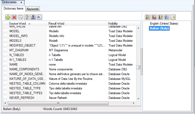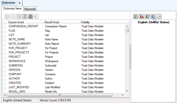 2. In Toad Data Modeler select Settings | Dictionaries. New Dictionaries tab opens.