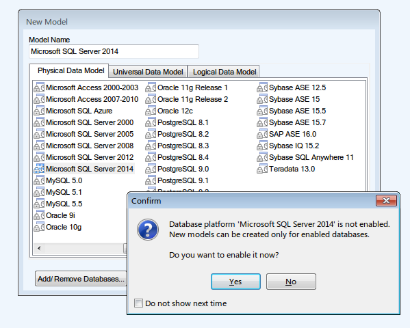 Disabled databases cannot be used in certain application actions (create new model, open existing model, reverse engineering...). However, most of the time you are able to enable a specific database at the time you want to work with it (see screenshot below).