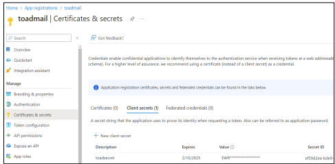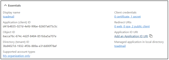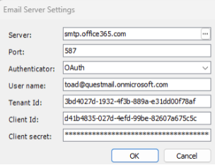 5. In Toad Data Point (this example), let’s set the email server specification (TenantID, ObjectID, and Secret_key).