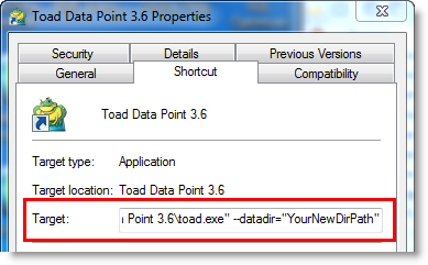 To instruct Toad to always use the new directory path, add the command switch and the new directory path to a Toad desktop shortcut. Then use the desktop shortcut when opening Toad.