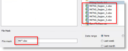 2. In the File mask field, enter the following: *.xlsx. This instructs the script to select all files with the extension .xlsx in that folder .