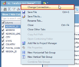In Toad Data Point 6.2, the Change Connection option is available on the Transform and Cleanse tab, mirroring the existing feature on the Pivot Grid tab. This enhancement simplifies the process of using a single template across multiple connections to the same data source, eliminating additional steps. Right-clicking on the Transform and Cleanse tab reveals the Change Connection option, making it easy to seamlessly switch between connections of the same type of data source: