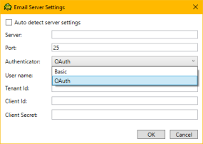 This update provides users with the flexibility to select between Basic and OAuth authentication methods. The default authenticator remains as Basic, preserving familiarity for users. Opting for OAuth authentication grants access to additional options such as Tenant ID, Client ID, and Client Secret, ensuring a heightened level of security and customization in their email server connections: