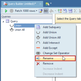 In this release of Toad Data Point, Union and Union All operators now can be renamed directly in the Query Builder tab, by using the Rename option from the right-click context menu. This enhancement aims to improve query clarity, particularly in large and complex queries, providing users with a more organized and user-friendly query-building experience: