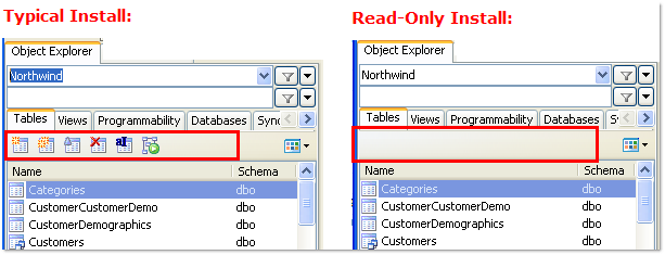 During installation, you can select an option to install Toad as a read-only application. This lets you query data and view objects using Toad, but all actions that can impact the database (Create, Alter, Drop, Insert, Update, etc.) are disabled or hidden. This ensures that you can use Toad without worrying about committing a change to a sensitive production instance. The following image shows an example of the differences between a typical and a read-only installation: