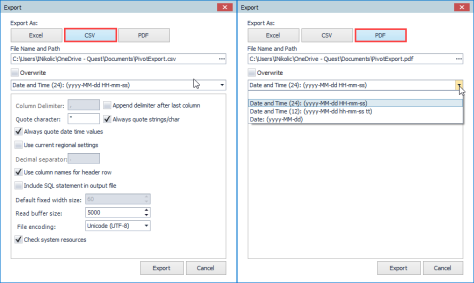 In Toad Data Point's Pivot Export, when opting for PDF, users will now encounter an enriched "Export As" window. This window provides a manually editable "File Name and Path" field and an Eclipse button for convenient file location selection. File names can be customized with different suffixes.