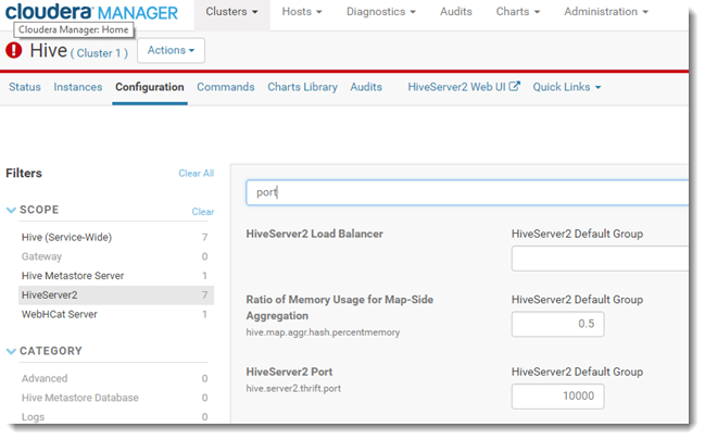 Enter “port” in the filter search box to know the hive transport mode and port configuration in this Hive server.