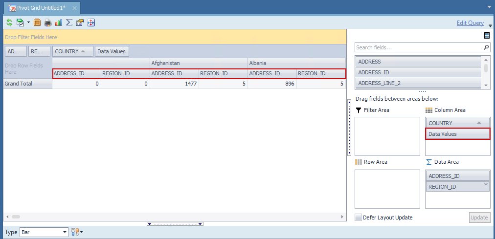 When the Data Values item is moved from the Column to the Row area, the format of the Pivot Grid remains the same. Only the headers of the Data area columns are moved under the Row columns in the Pivot Grid:
