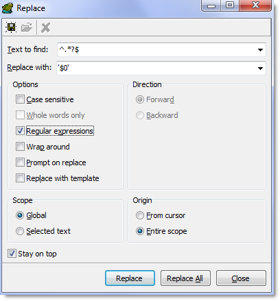 If text is highlighted prior to opening the Find dialog box, that text will be placed into the Text to Find data entry box. If no text is highlighted, then the word at the cursor will be placed in the Text to Find data entry box. The last n find items are available in the drop-down list. They are NOT saved from Toad session to Toad session.